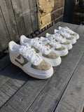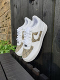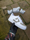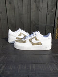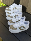 White AF1 with a stunning designer material, cut and then glued over the toe box and the swoosh side boxes on both sides of each shoe. We apply and glue in such a way which it creates maximum durability so the material does not come off even after extensive wear. Once order is placed if you would like a different material on the shoe make sure to send us a screen shot of your order and we will happily add a designer material of your choice.