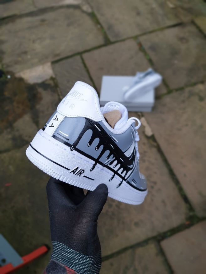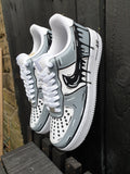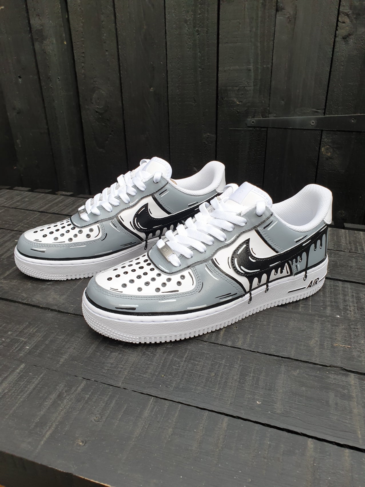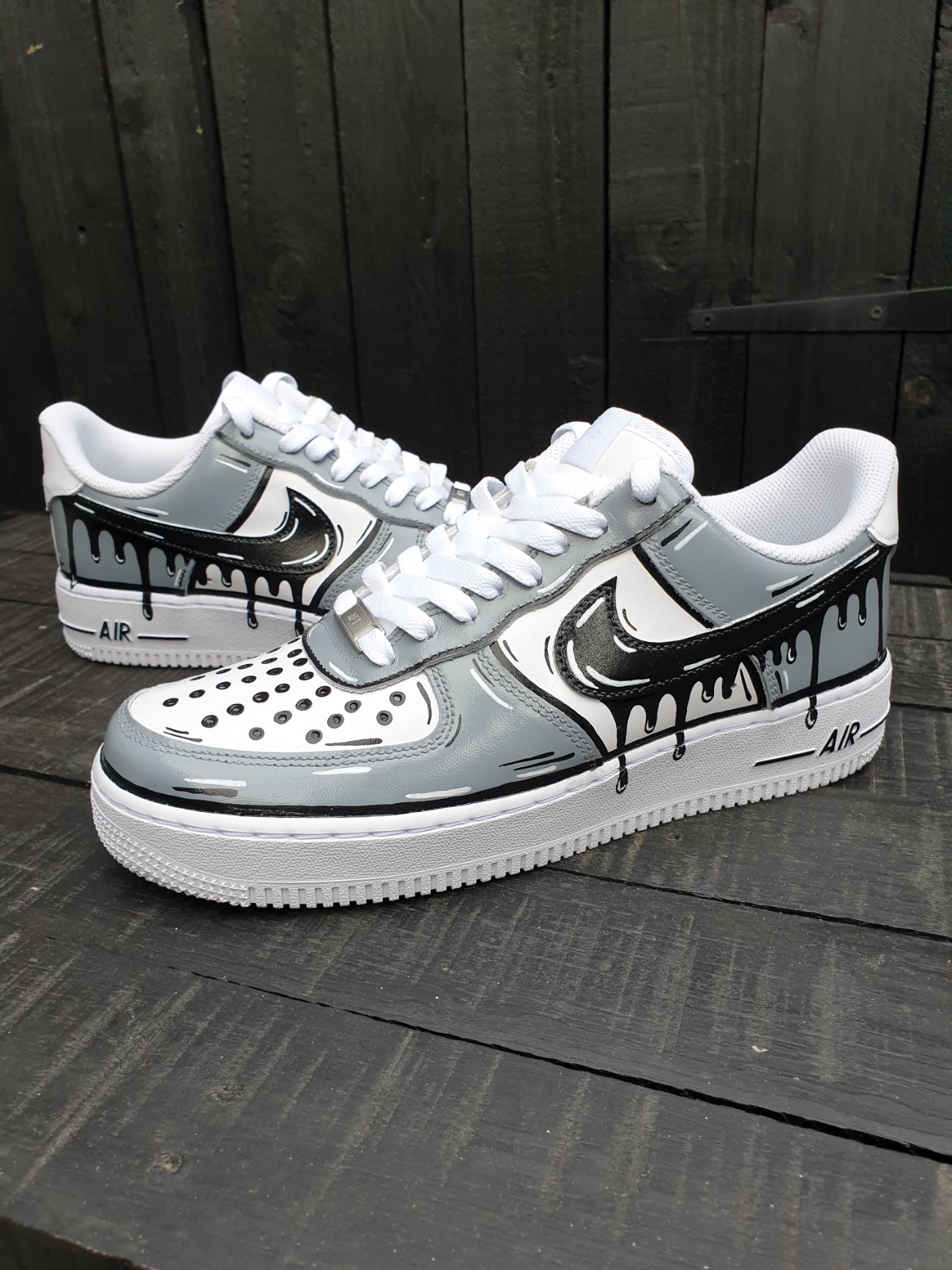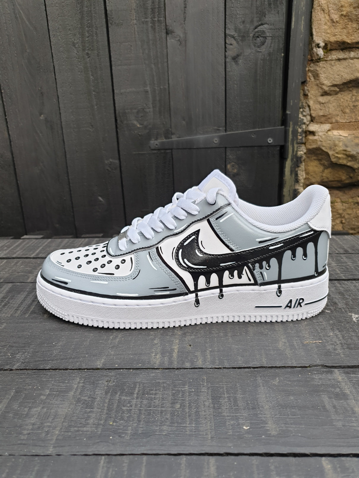 White AF1 with an amazing cartoon sketch effect hand painted across the whole trainer with an amazing smokey grey color theme. Topped of with a cool drip effect on the swooshes to make the design stand out. This custom is also available in any color scheme of your choice once ordered just send us a message on Instagram and we will sort you out with any color scheme of your choice.