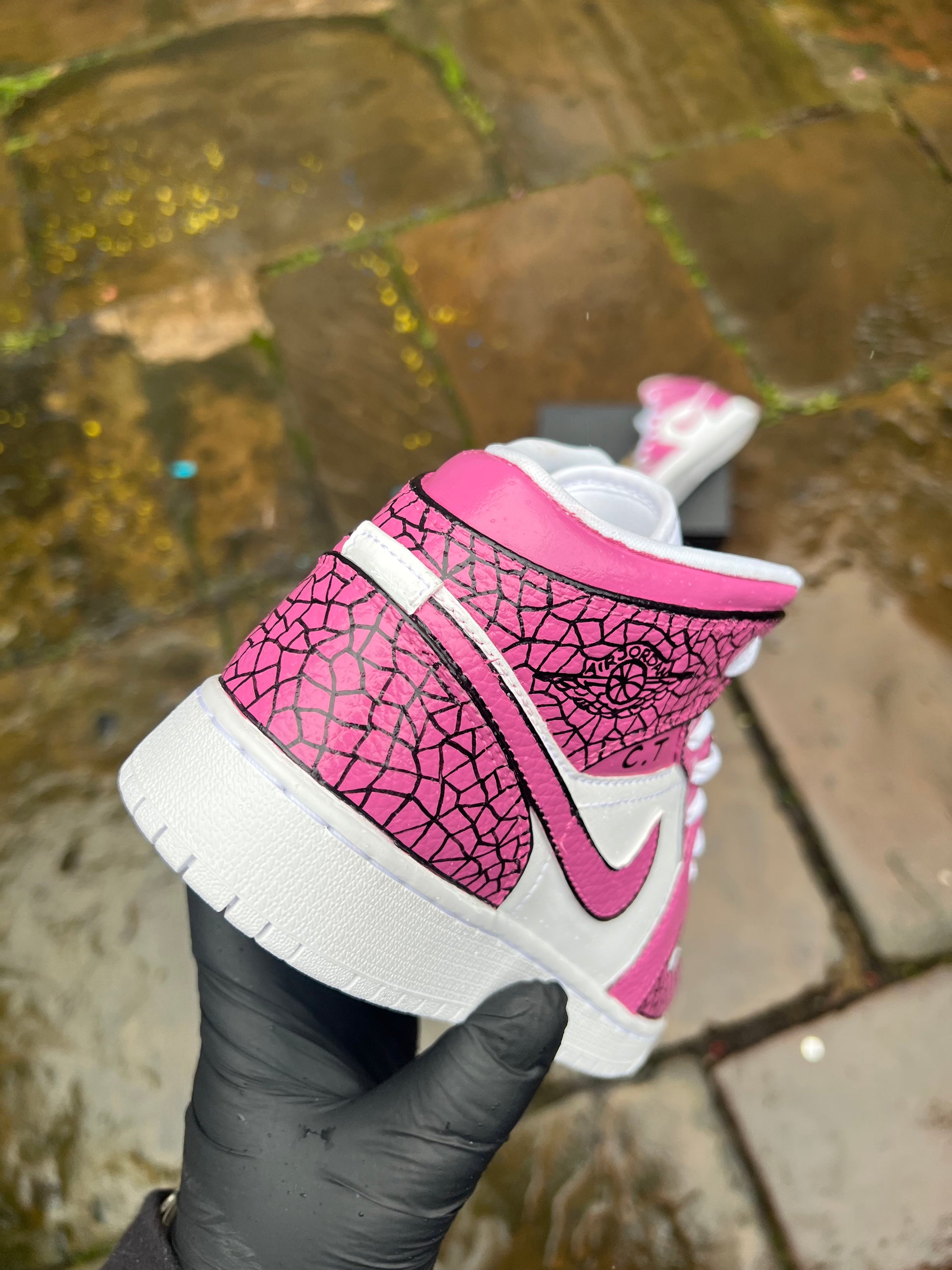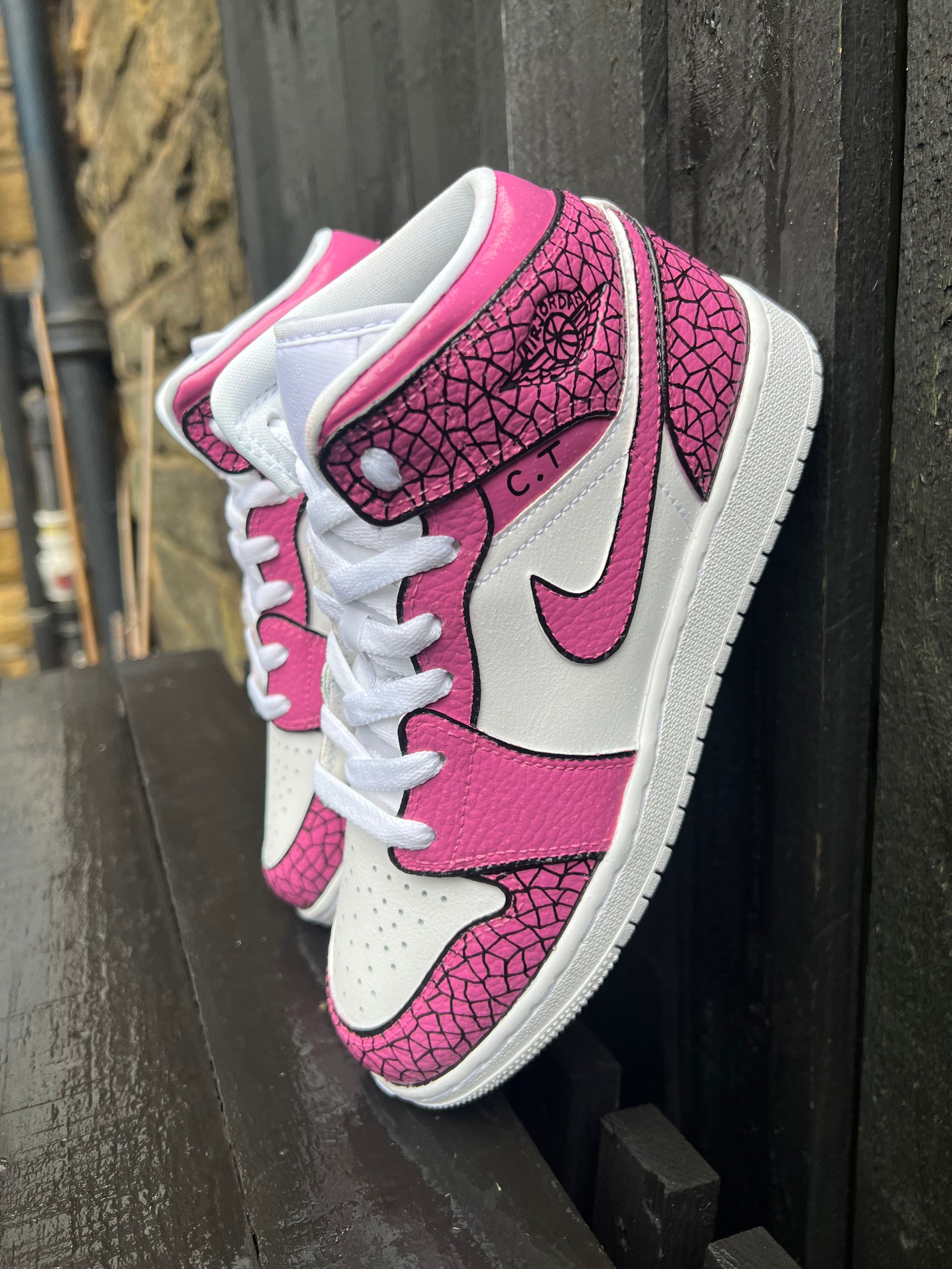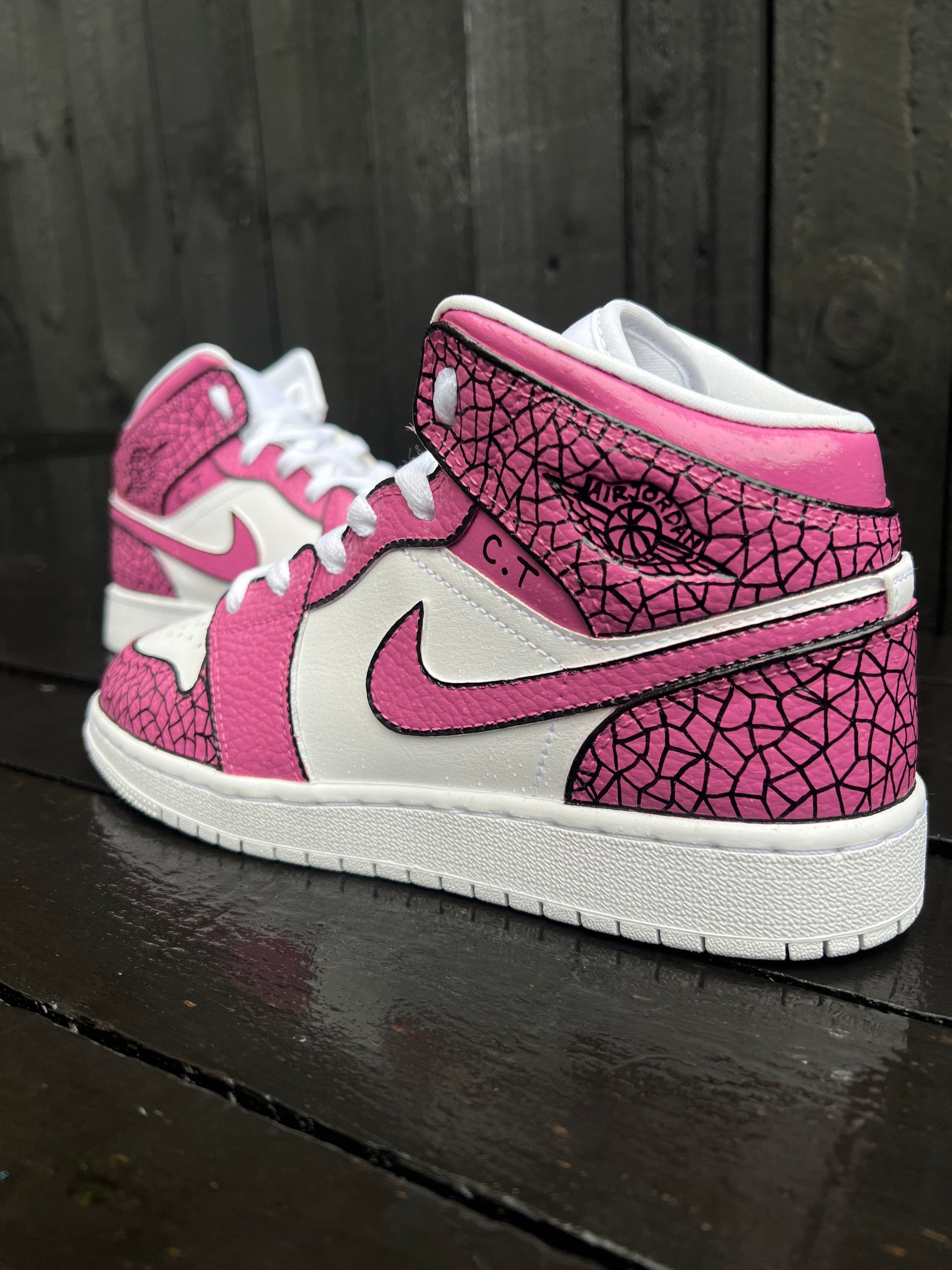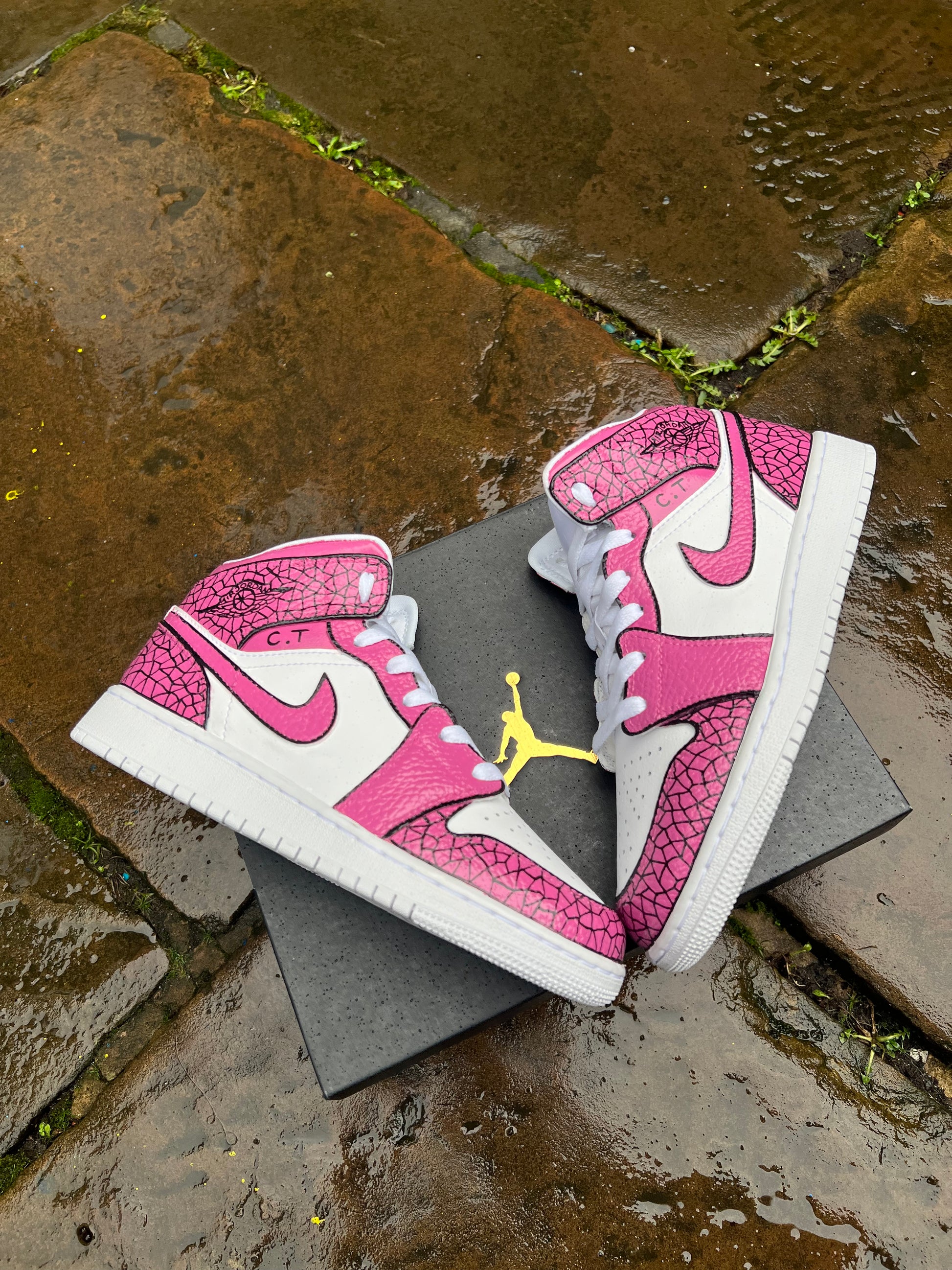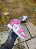 White J1 with an amazing custom kickz speacial design hand painted across the whole trainer with an amazing hot pink color theme. Topped of with a cool cartoon effect on the swooshes to make the design stand out. This custom is also available in any color scheme of your choice once ordered just send us a message on Instagram and we will sort you out with any color scheme of your choice.