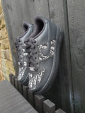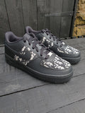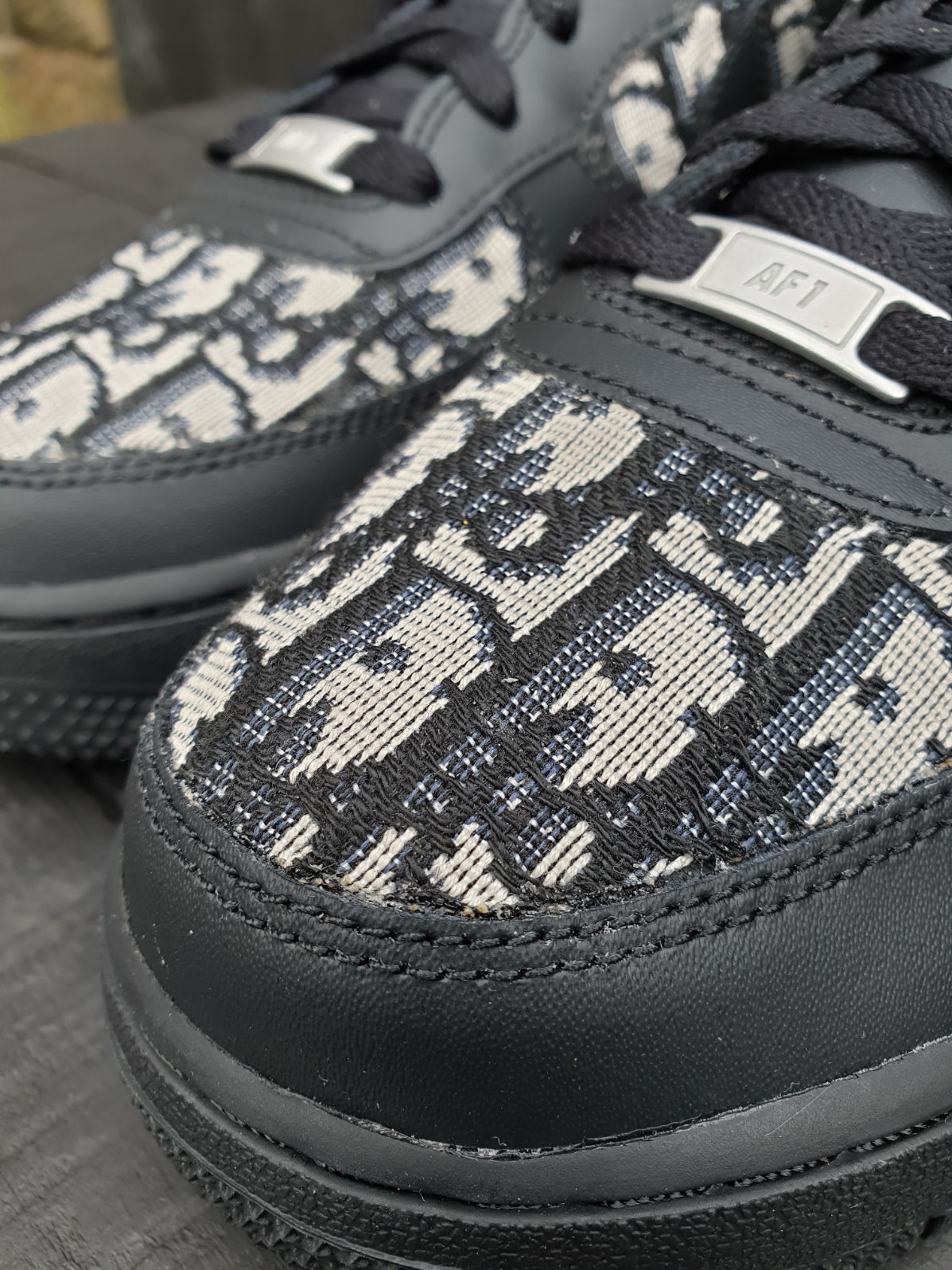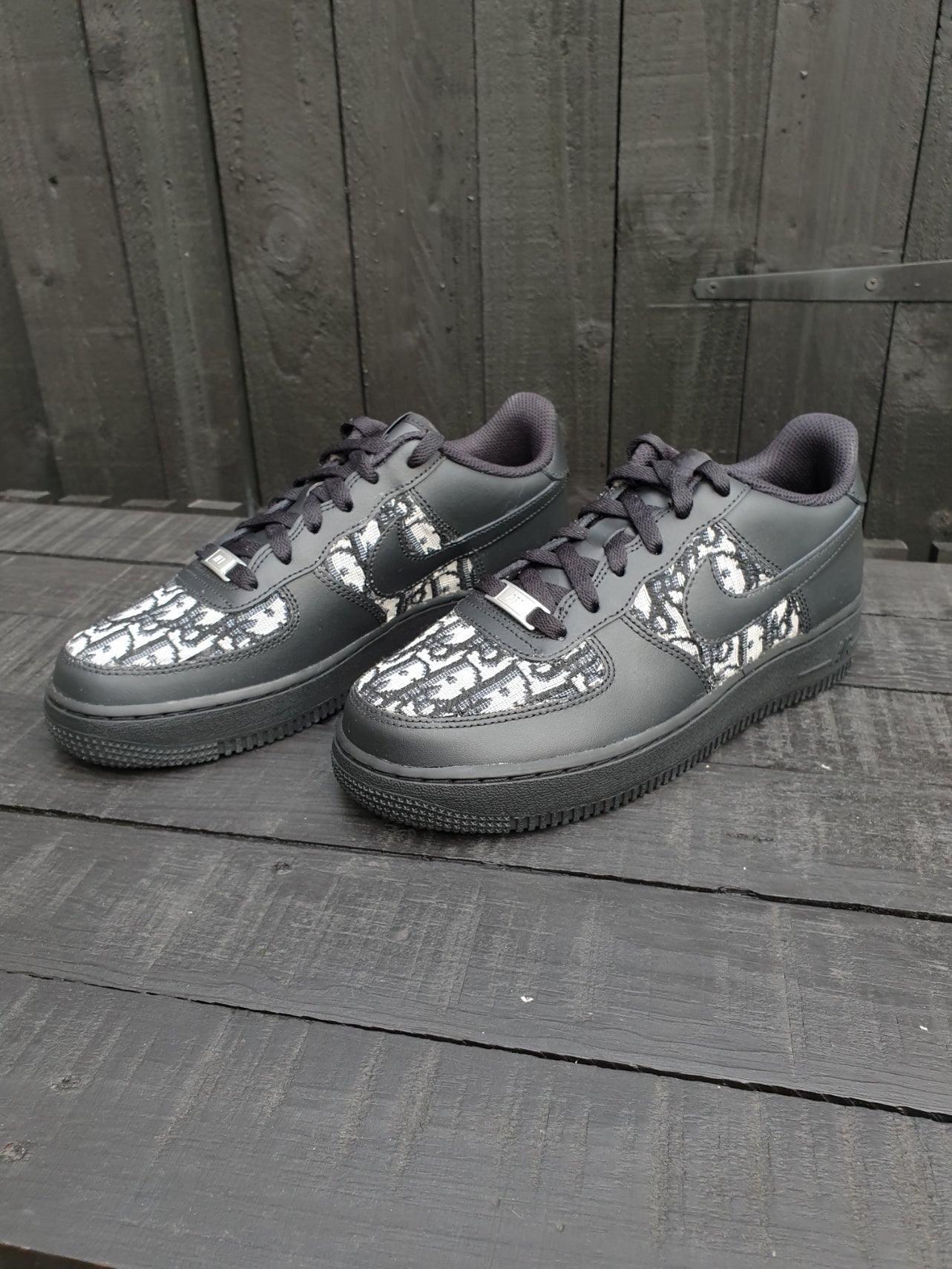 Black AF1 with a stunning designer material, cut and then glued over the toe box and the swoosh boxes on both sides of each shoe. We apply and glue in such a way which it creates maximum durability so the material does not come off even after extensive wear. Once order is placed if you would like a different material on the shoe make sure to send us a screen shot of your order and we will happily add a designer material of your choice.