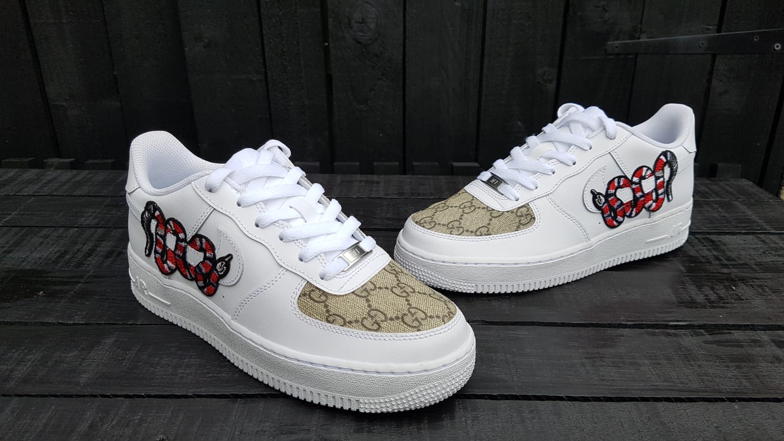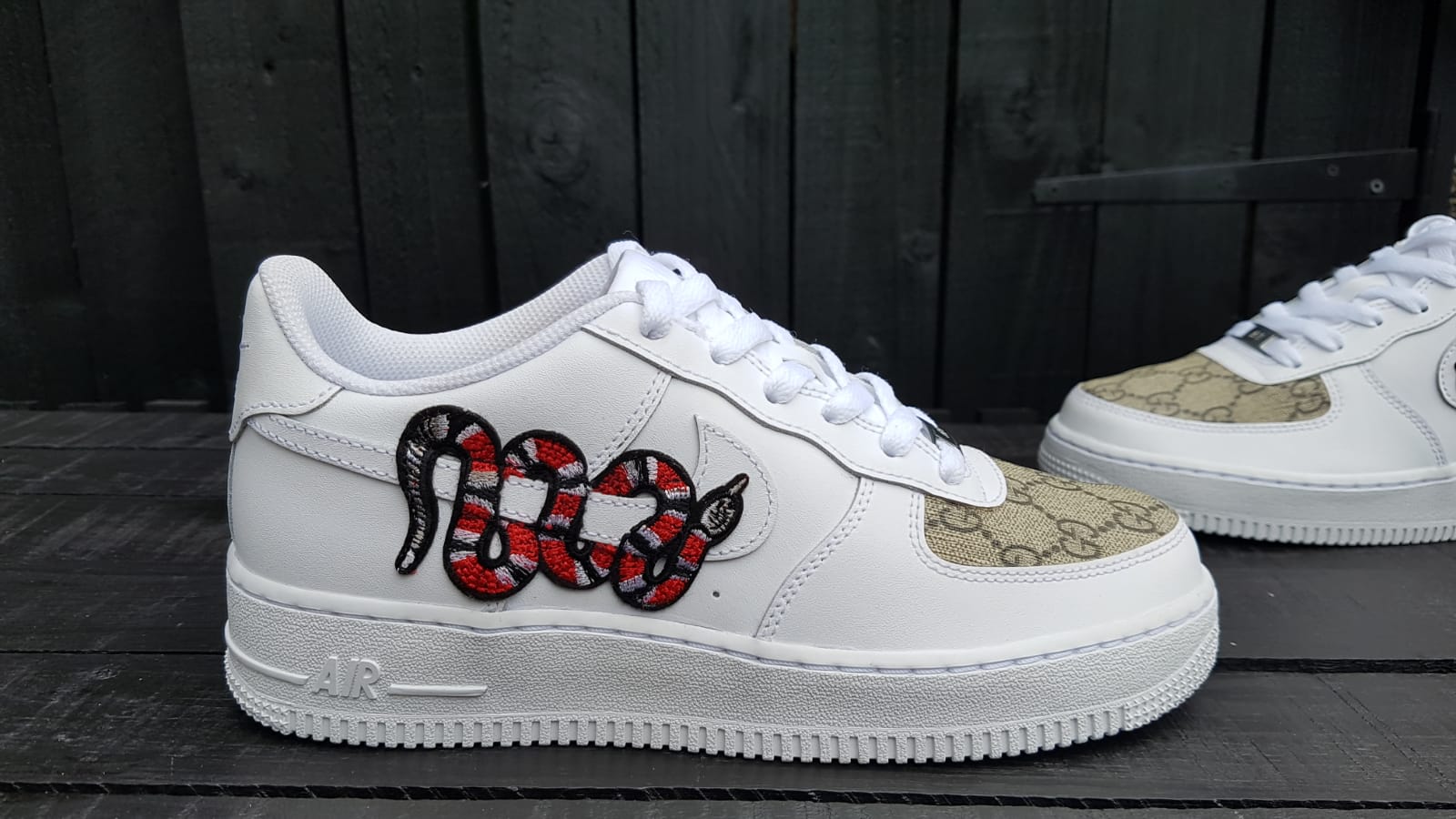 White AF1 with a stunning designer material placed at the front of the shoe as well as a beautiful embroidery snake patch placed on the ticks on the outer side swooshes of both trainers. The paint and various products we use ensure we have the best durability out there also so the trainers will last even after excessive wear.