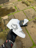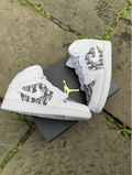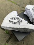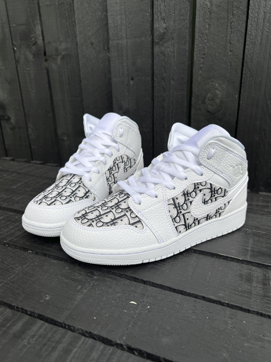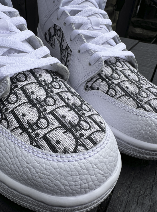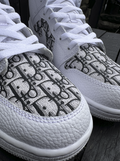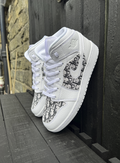 White J1 with a stunning designer material, cut and then glued over the toe box and the side boxes on both sides of each shoe. We apply the material onto the shoe in such a way which gives maximum durability so the material does not come off even after extensive wear. Once order is placed if you would like a different material on the shoe make sure to send us a screen shot of your order and we will happily add a designer material of your choice.