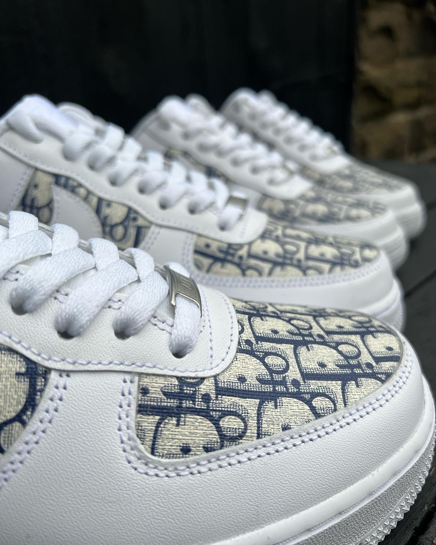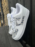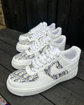 White AF1 with a stunning cream and navy designer material, cut and then glued over the toe box and the swoosh side boxes on both sides of each shoe. We apply and glue in such a way which it creates maximum durability so the material does not come off even after extensive wear. Once order is placed if you would like a different material on the shoe make sure to send us a screen shot of your order and we will happily add a designer material of your choice.