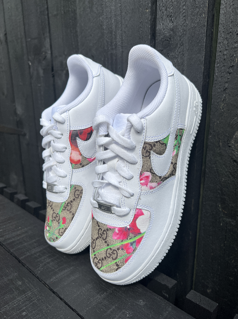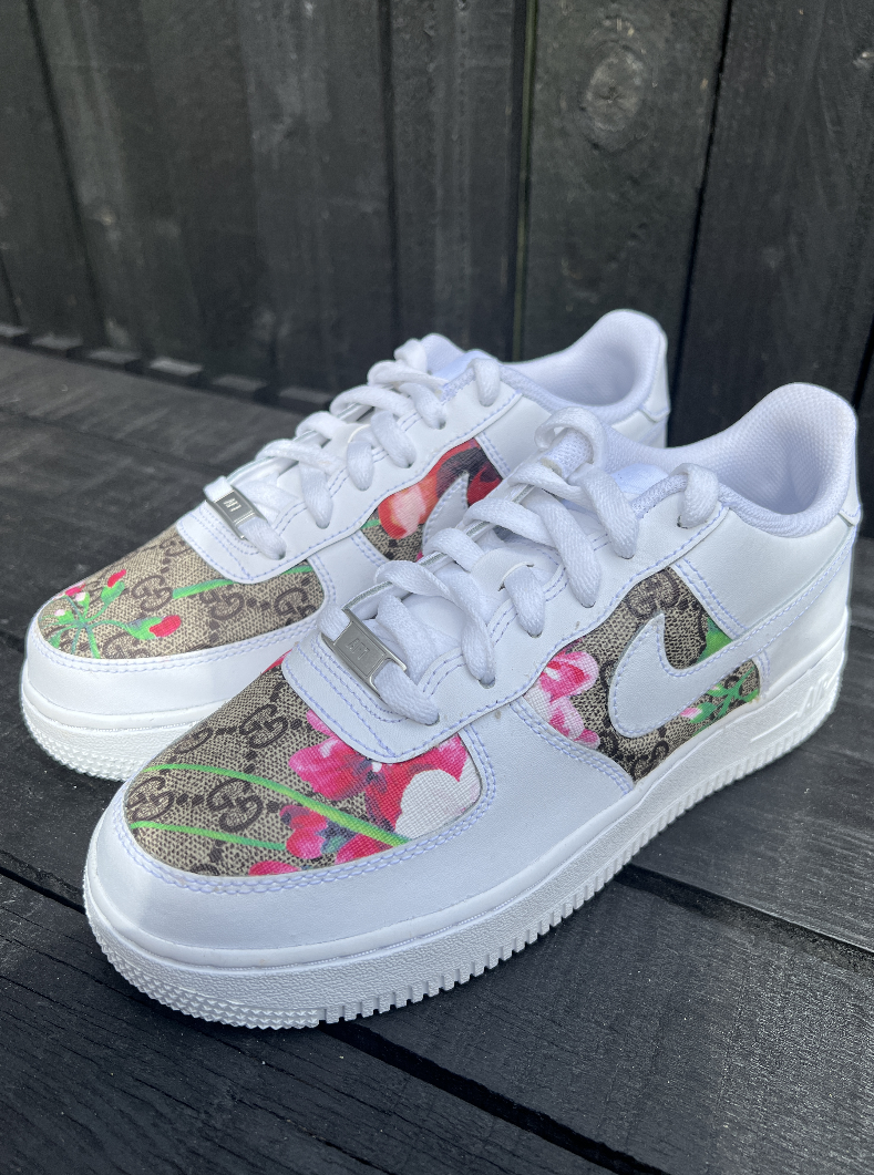 White AF1 with a stunning pink bloom designer material, cut and then glued over the toe box and the swoosh side boxes on both sides of each shoe. We apply and glue in such a way which it creates maximum durability so the material does not come off even after extensive wear. Once order is placed if you would like a different material on the shoe make sure to send us a screen shot of your order and we will happily add a designer material of your choice.