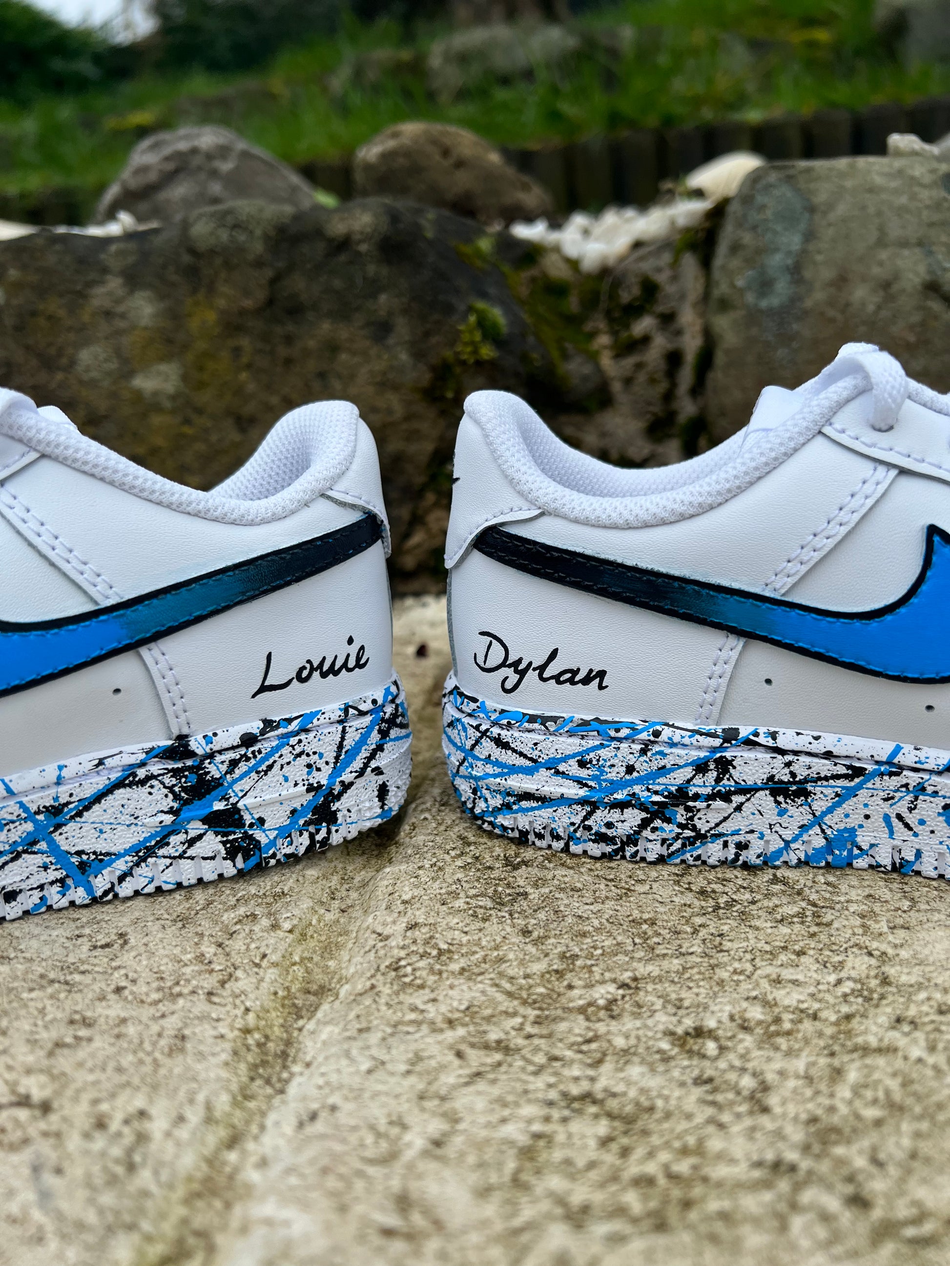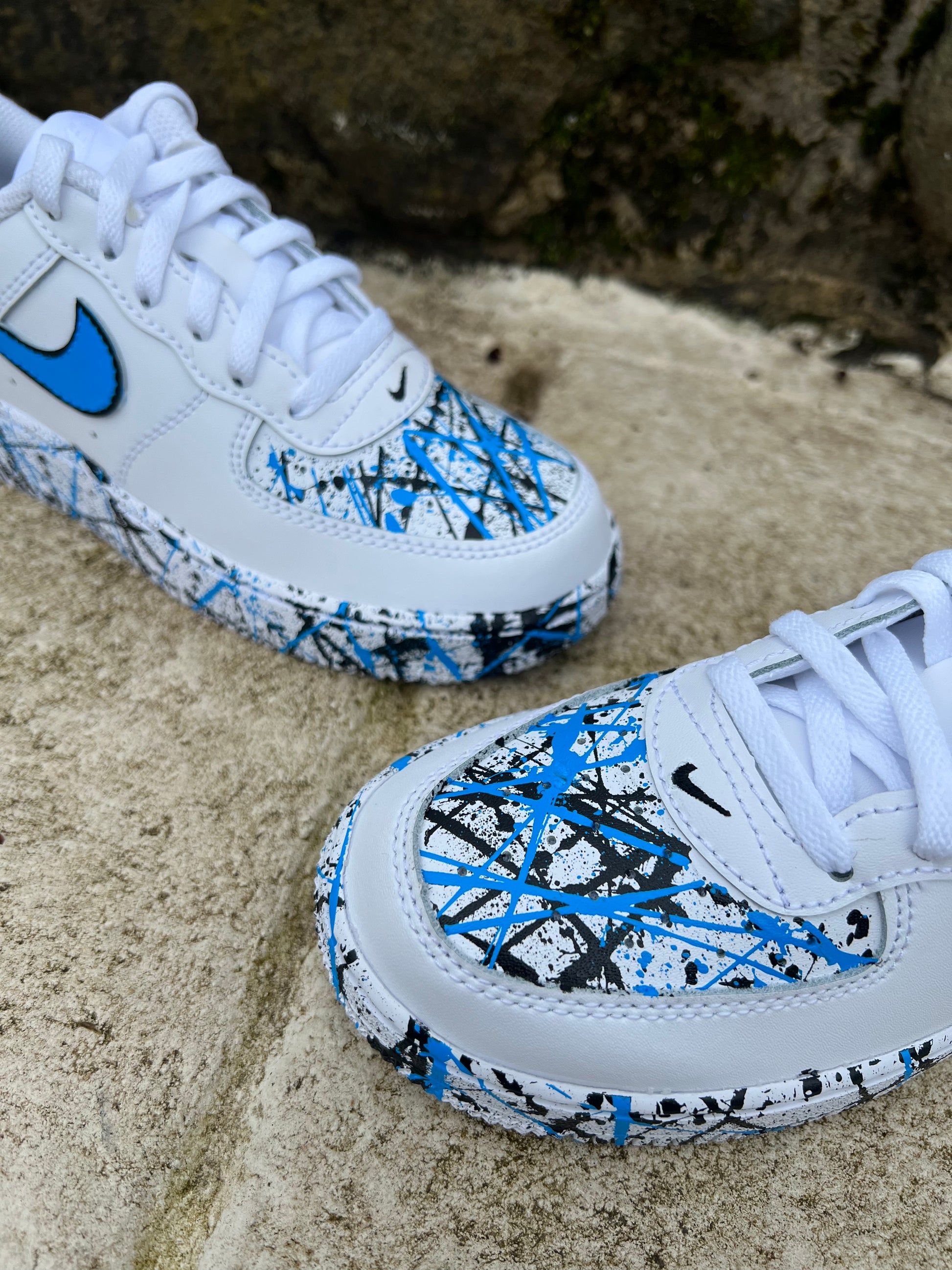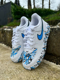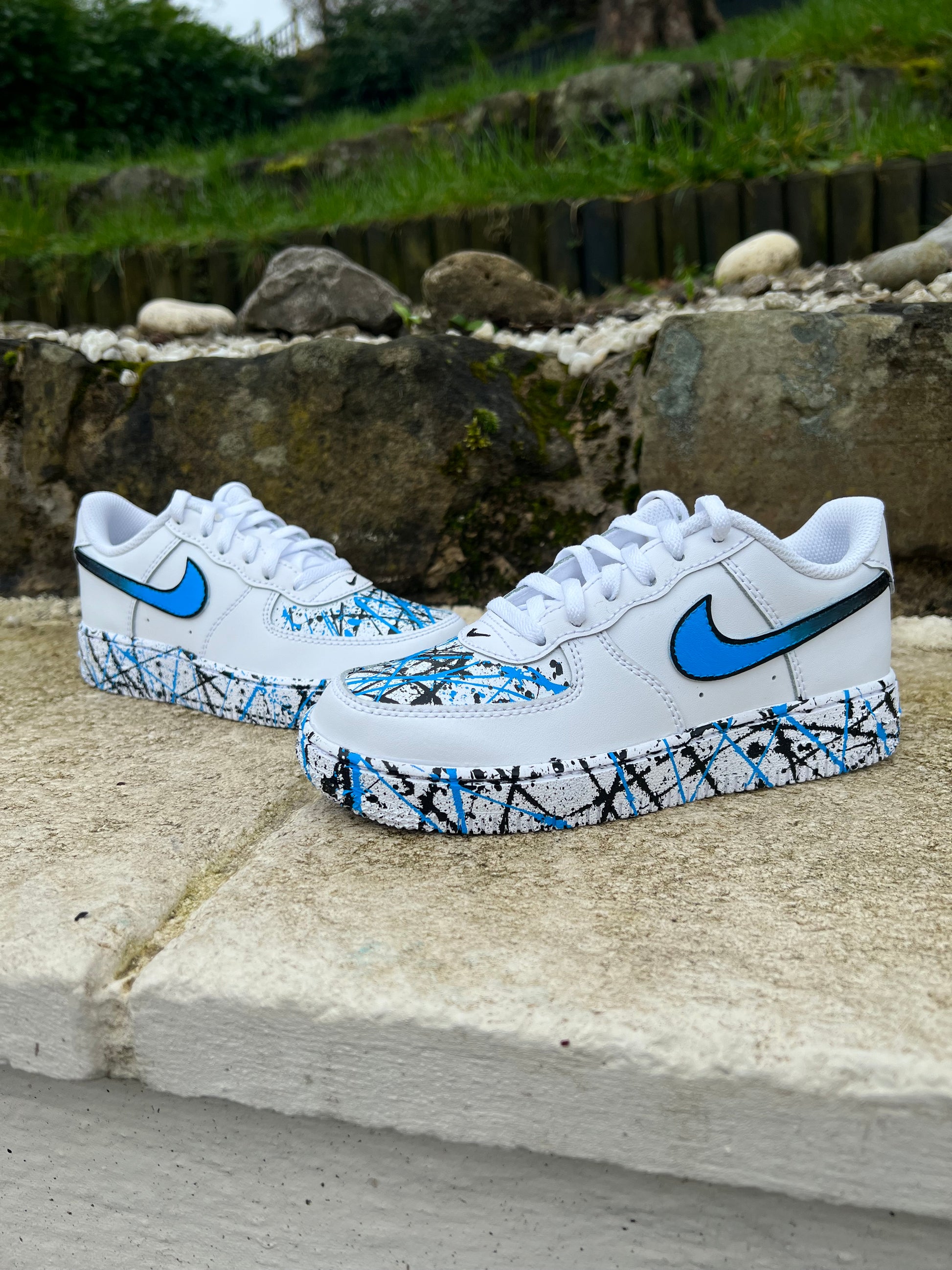 White AF1 with a crazy splatter effect splattered across the soles and the front toe box of the trainer in a awesome blue and black color scheme topped of with some stunning faded swooshes on all sides. The paint and various products we use ensure we have the best durability out there also so the trainers will last even after excessive wear. This custom is also available in any size and any color scheme of your choice once ordered just send us a message on Instagram and we will sort you out with any color scheme of your choice.