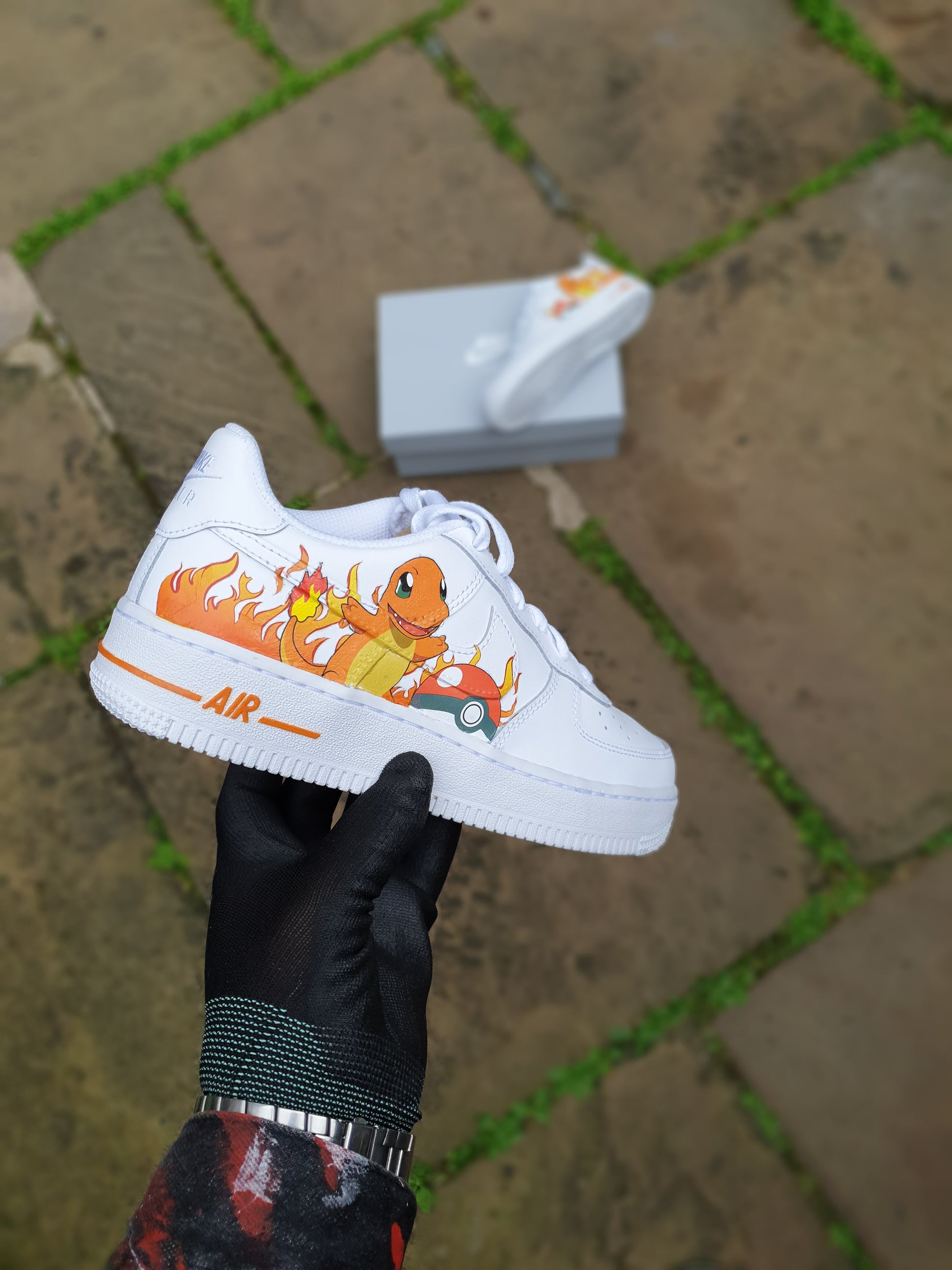 White AF1 with a cool Pokemon Charizard hand painted across the outer side of both trainers with beautiful orange detailing to enhance the design. This custom is also available in any size and in any Pokemon character of your choice once ordered just send us a message on Instagram and we will sort you out with any Pokemon character of your choice.