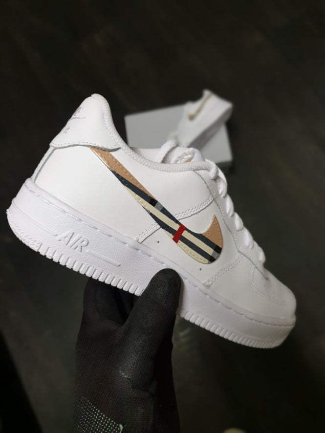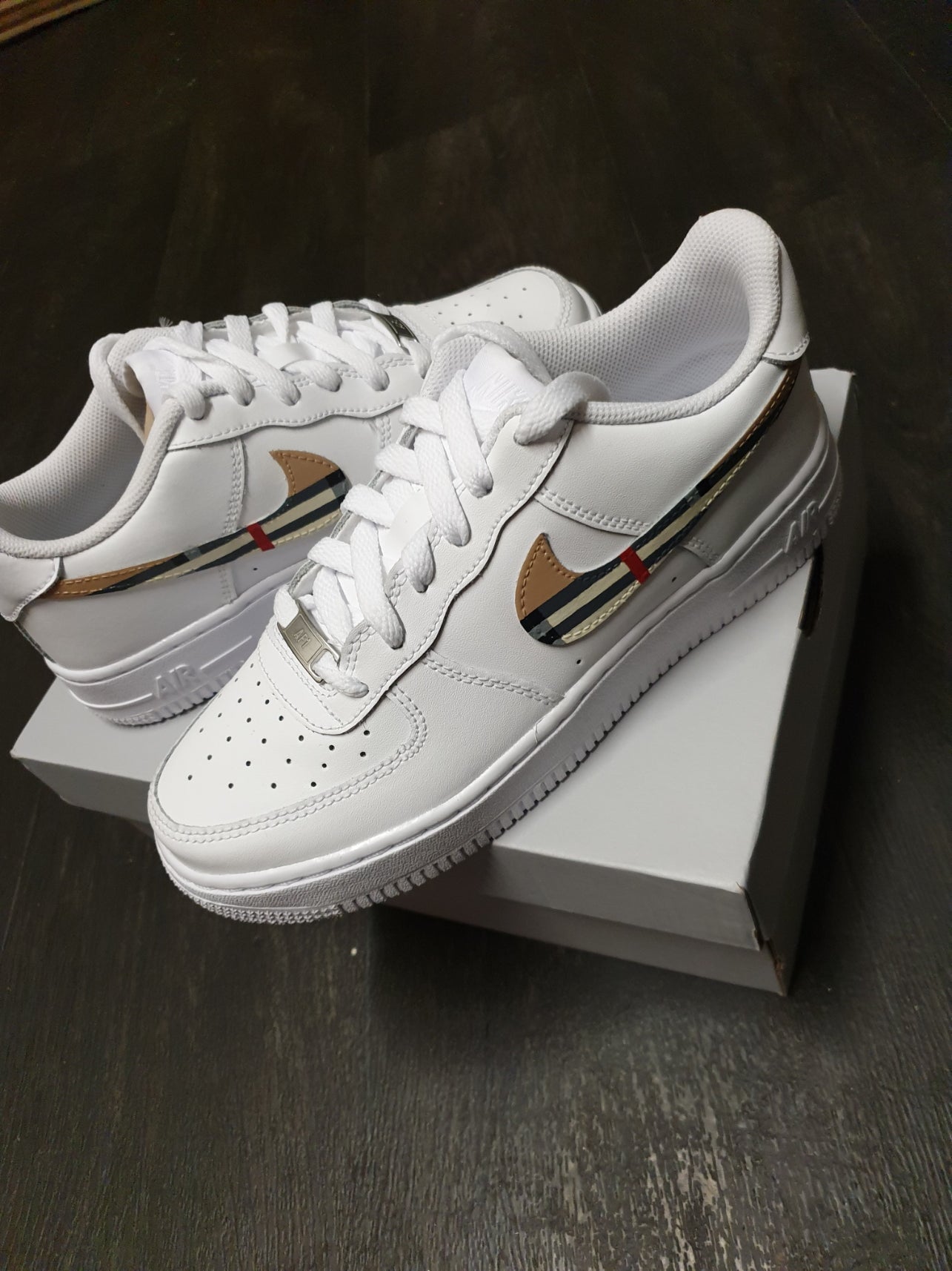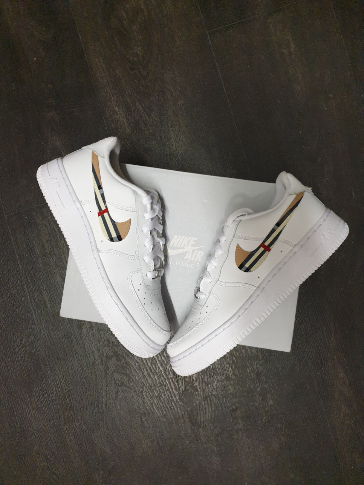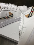 White AF1 with a stunning designer print hand painted across all swooshes on this pair of kickz.