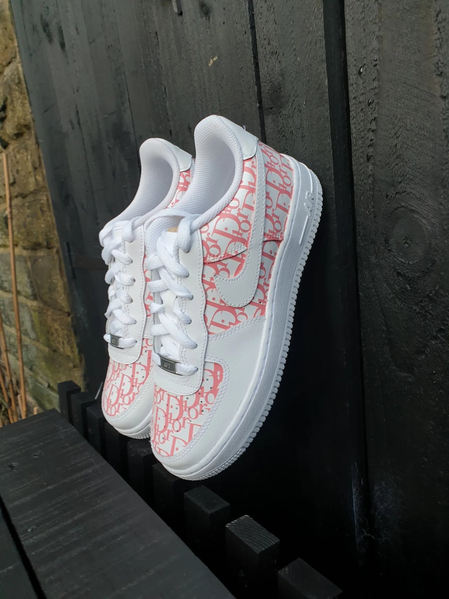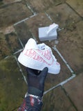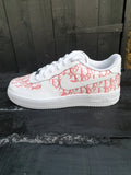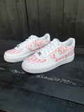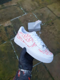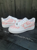 White AF1 with a stunning designer hand painted design across the full side of the trainer as well as the front toe box which has also been hand painted. The paint and various products we use ensure we have the best durability out there also so the trainers will last even after excessive wear. This custom is also available in any size and any color scheme of your choice once ordered just send us a message on Instagram and we will sort you out with any color scheme of your choice.