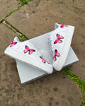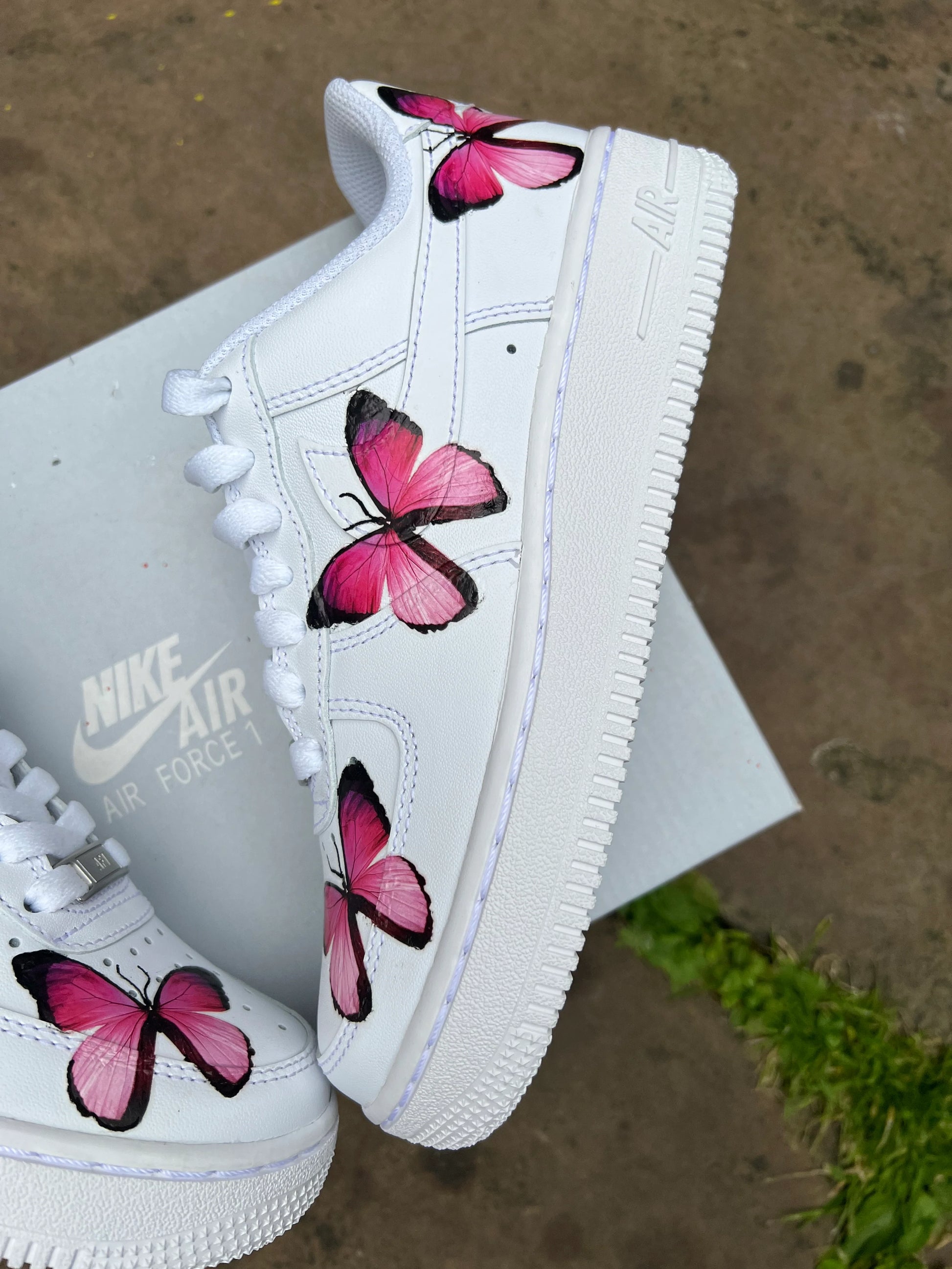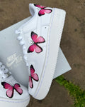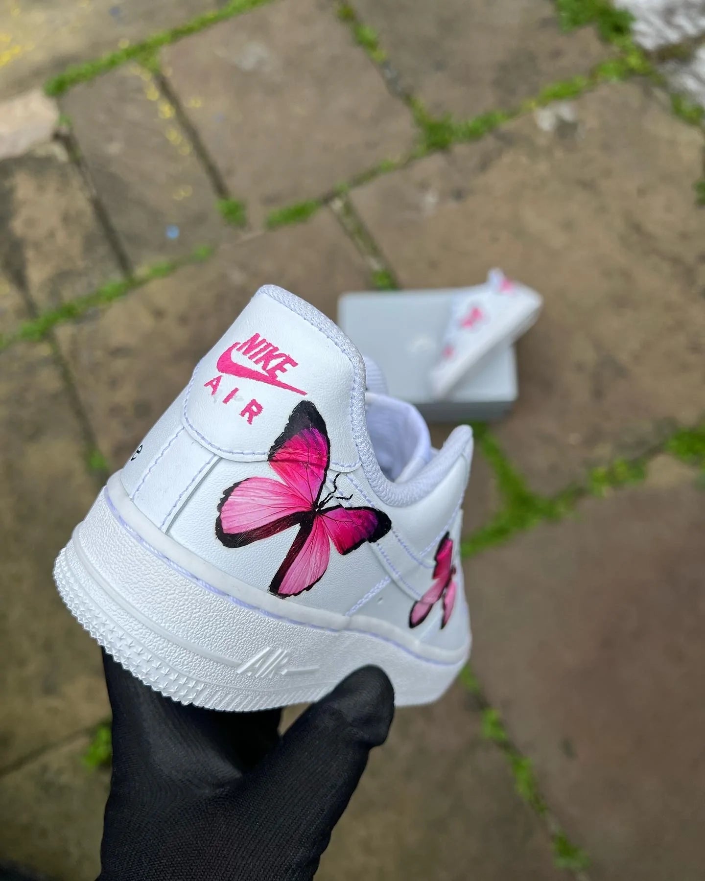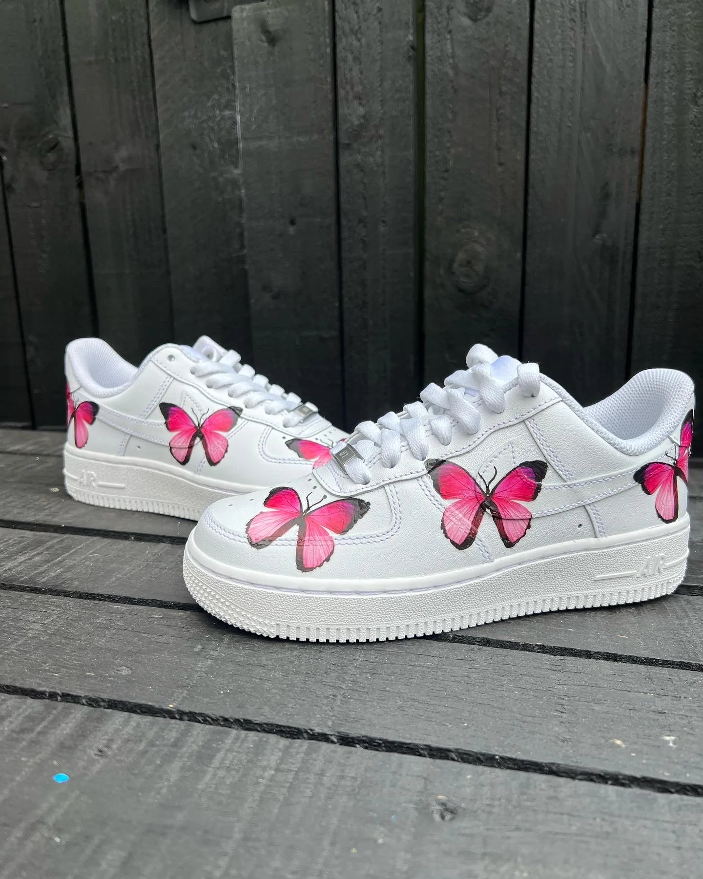 White trainers with beautiful pink butterfly hand painted all over the outer sides of the trainers. including small pink detailing which has also been done on the back tabs of the trainers.